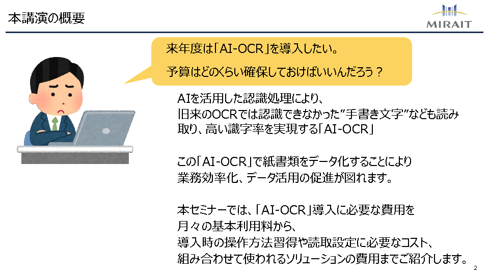 本セミナーでは、AI-OCR導入の代表的なケースに即した費用感をご説明いたします。