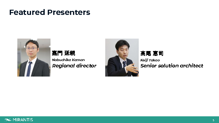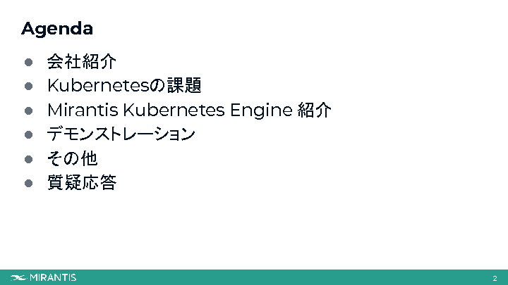本セミナーではMirantis Kubernetes Engineの機能やメリットを紹介しながら、Kubernetesをシンプルに使いこなす方法を解説いたします。