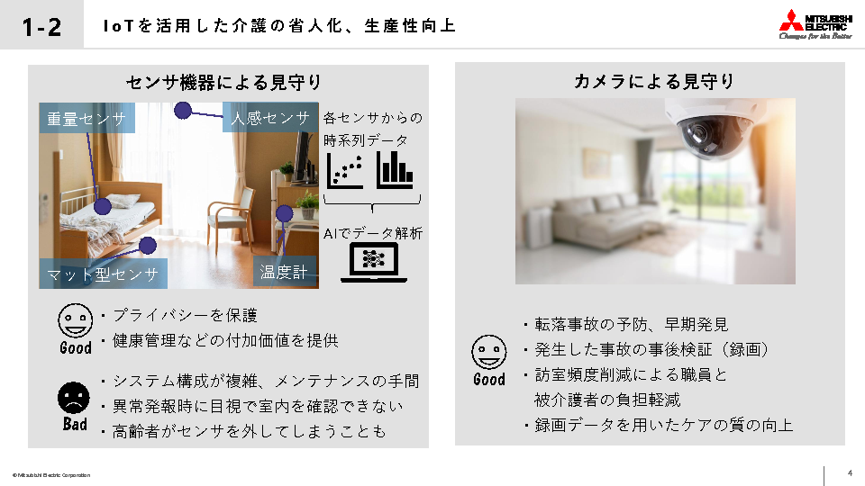 見守りといえば、真っ先に思い浮かべるのは監視カメラ。しかし、生活の場では見守られる方が監視されていると感じないようにする配慮が求められます。