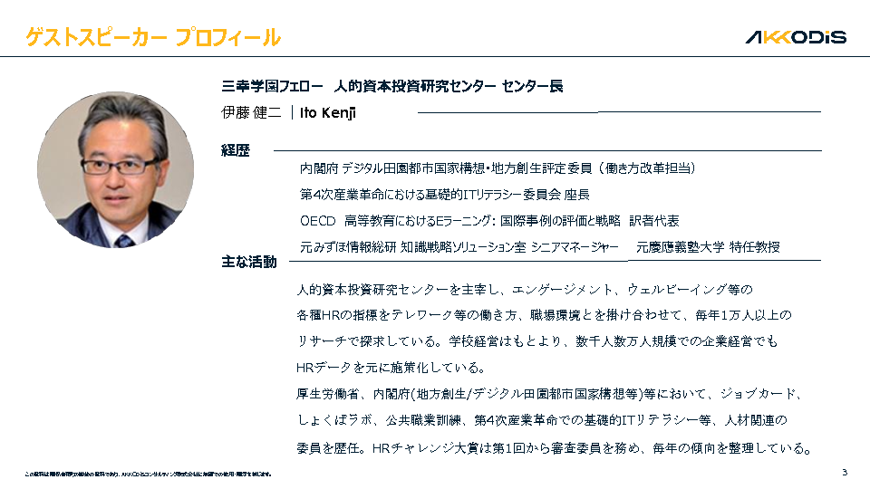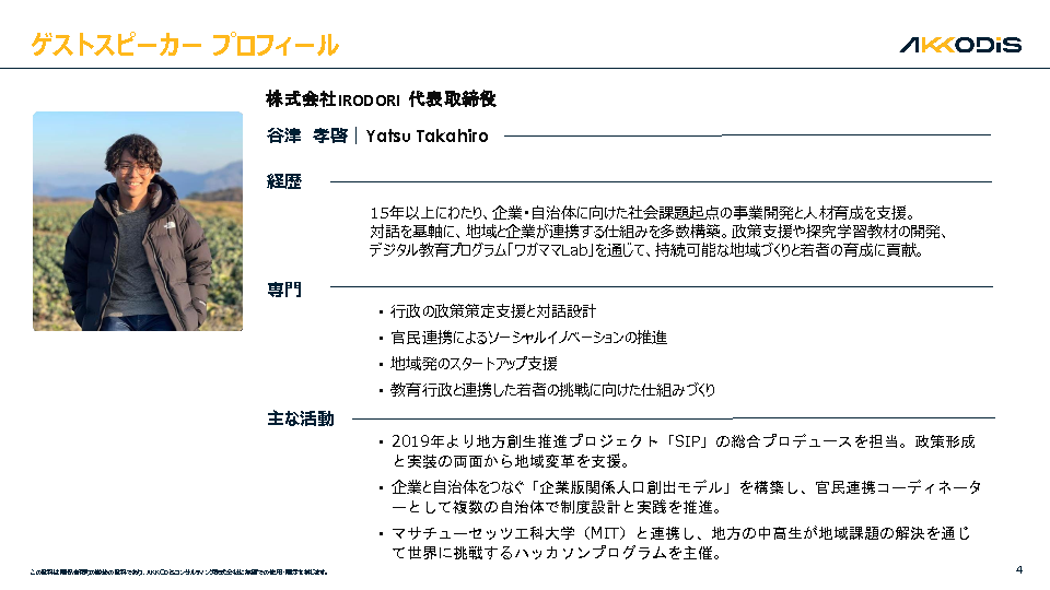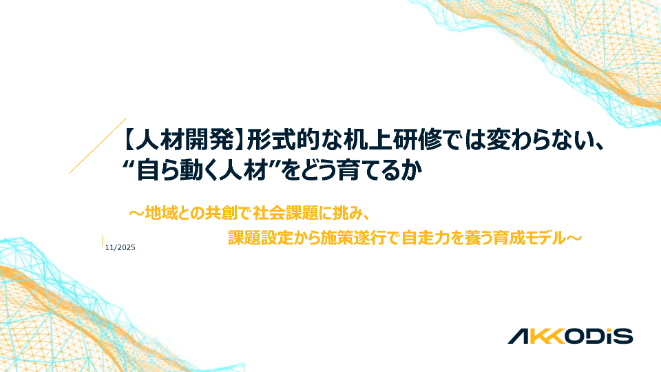 本セミナーでは、AKKODiSが展開する「SIP(Social Innovation Partners)」の取り組みを通じ、地域との共創を軸に、社員が社会課題に挑みながら実践的に成長する新しい育成モデルを紹介します。社員が実際に地方自治体(行政)に入り、地域の課題設定から施策遂行までを自ら設計・実行することで、“自走力”や“巻き込み力”、“課題解決提案力”といった行動スキルが自然と育まれます。こうした越境的な学びは、個人の視野を広げるだけでなく、組織全体の創造性・共創力を高め、人的資本経営の実装にもつながります。「座学では変わらない」育成の限界を超え、行動から人と組織を変えていく、その具体的な設計と成功のポイントを、実践事例を交えてお伝えします。