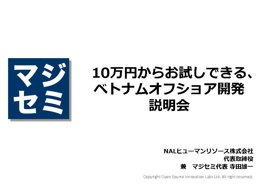 今回は、いつも説明している以下の内容に加えて、オープンソース活用研究所 寺田が実際にベトナムオフショア開発を委託してみた体験についてお話しします。
