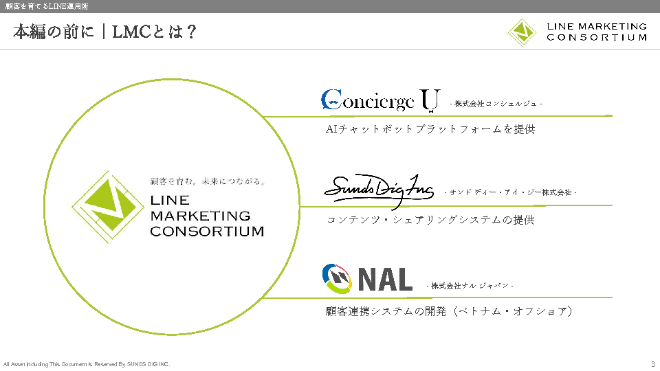 現在は、大手AIチャットボットプラットフォーム「Concierge U(コンシェルジュ)」と連携し、LINE上でのMA,コンテンツマーケティングの企画開発に力を入れて取り組ませていただいています。