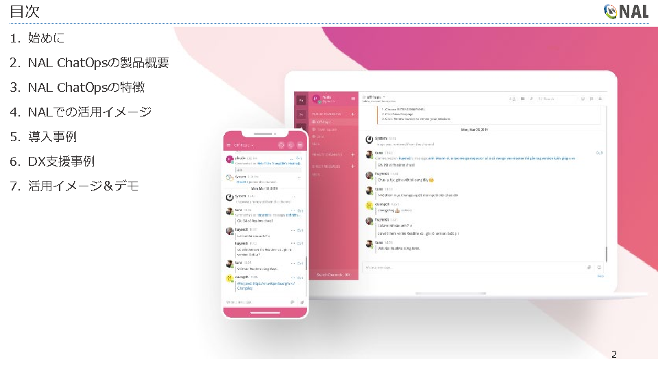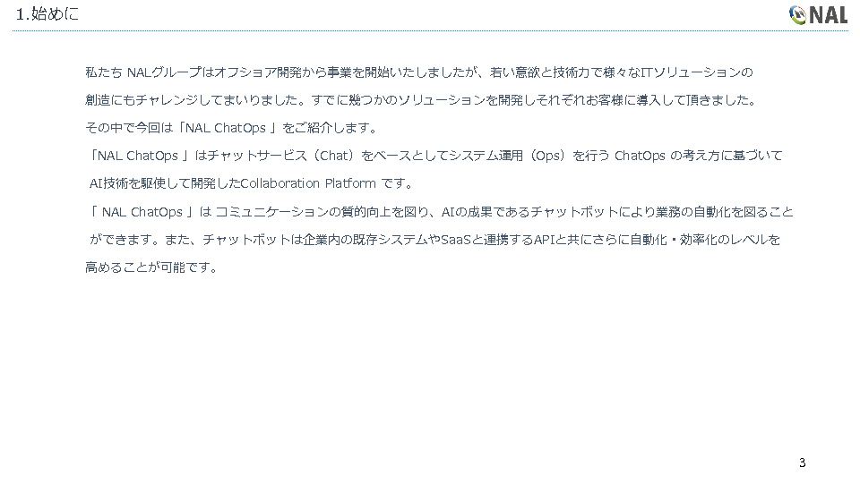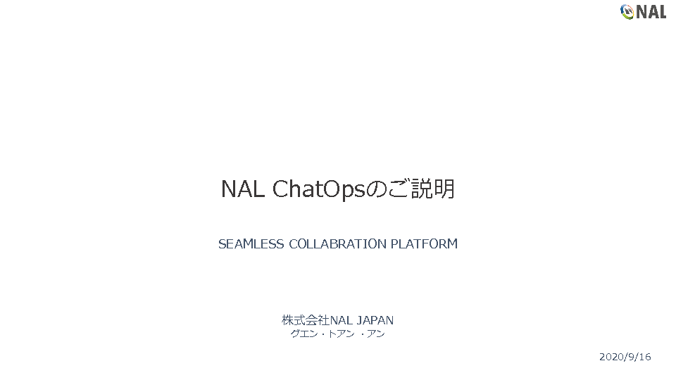 本セミナーでは、株式会社NAL JAPANが提供する業務自動化チャットツール「ChatOps」についてご紹介するとともに、実際の活用事例についてもご紹介します。