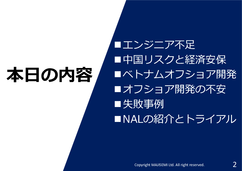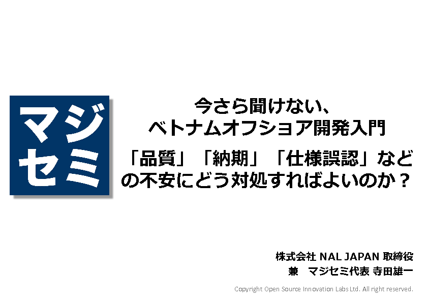 本セミナーでは、10社以上のベトナムオフショア開発企業と取引がある、マジセミ寺田が、オフショア開発の失敗事例も交えながら、このような不安にどのように対処すればよいのか解説します。