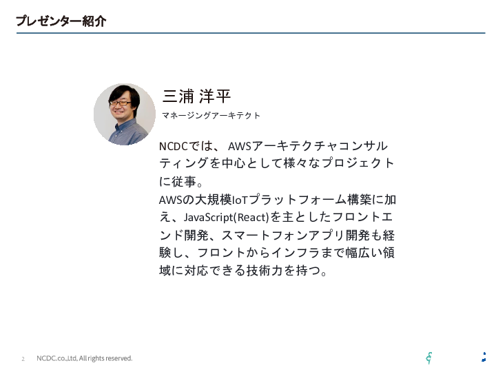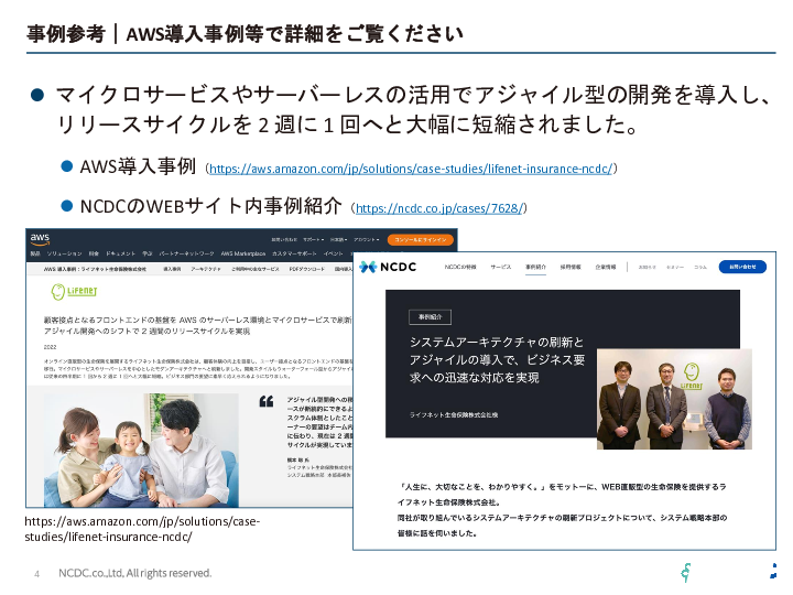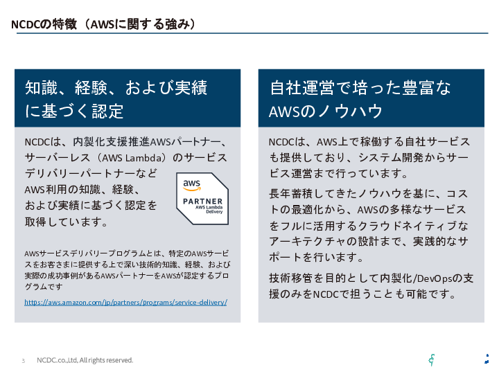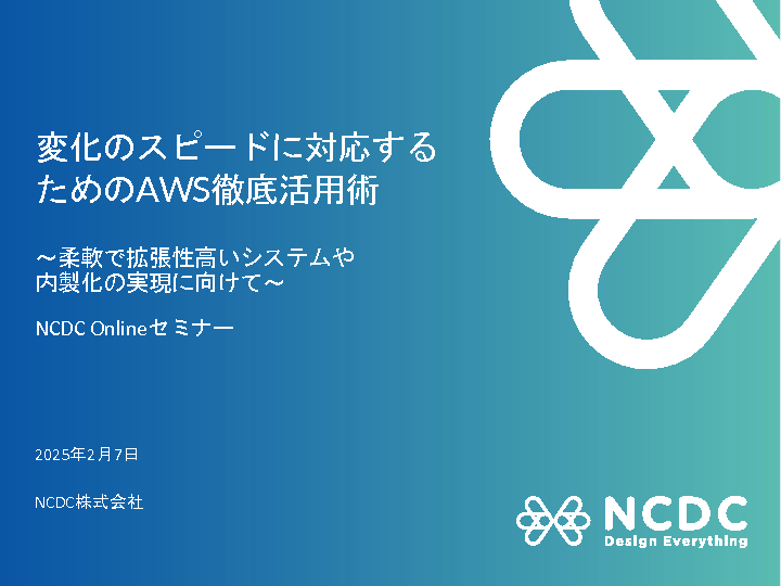 AWSの豊富なノウハウと経験を元にした、NCDCの内製化支援、DevOps支援サービスを内製化の成功事例とともにご紹介します。