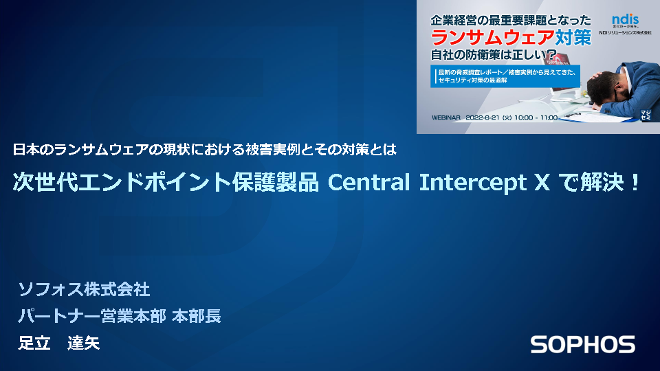 本セミナーでは、ソフォスが2022年1-2月に、31ヵ国、5,600 名のIT管理者を対象に実施した調査レポート「ランサムウェアの現状2022年版」を踏まえ、日本国内のIT管理者からの回答やランサムウェアの被害事例を紹介。サイバーセキュリティの要である「次世代アンチウィルスシステム」によるエンドポイントセキュリティ対策を解説します。