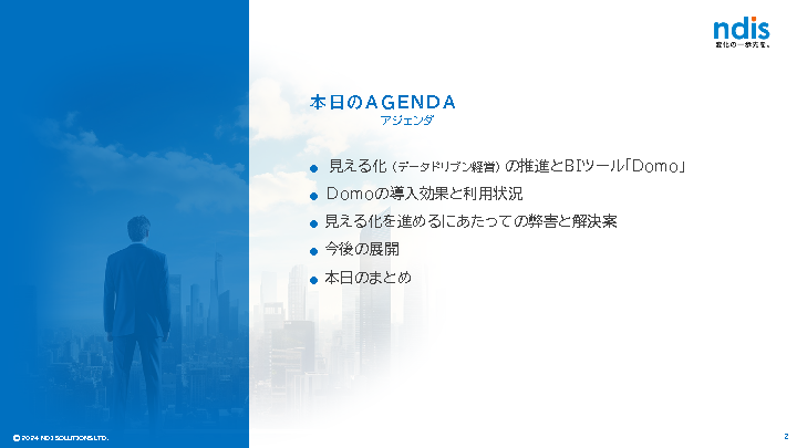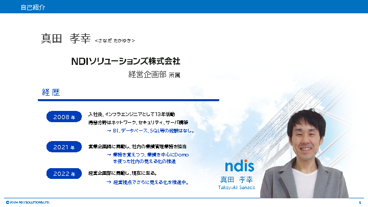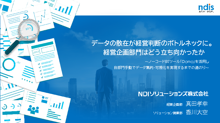 本セミナーでは、このようなNDISの取り組みについて、直面した課題や苦労、Domoを活用してどのように解決したのかを赤裸々にお話します。データ活用に向けて同様の悩みを抱える経営企画部門の方々はぜひご参加ください。
