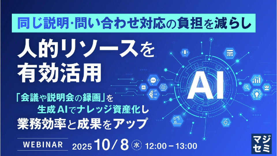 本セミナーでは、TeamsなどのWeb会議ツールで蓄積される会議・研修動画を、生成AIで “探せる・読める・共有できる” ナレッジ資産へと変える方法をご紹介します。具体的には、AIが動画から要点を整理し、キーワード検索やチャプター分割で必要な情報だけを即座に確認できる仕組みを解説します。また、研修動画をマニュアルやFAQとして再活用する事例や、会議録画を効率的に共有して手戻りを防ぐ方法も紹介。繰り返し説明や問い合わせ対応に費やしていた時間を大幅に削減し、人手不足でも成果を最大化する具体的なアプローチを提示します。