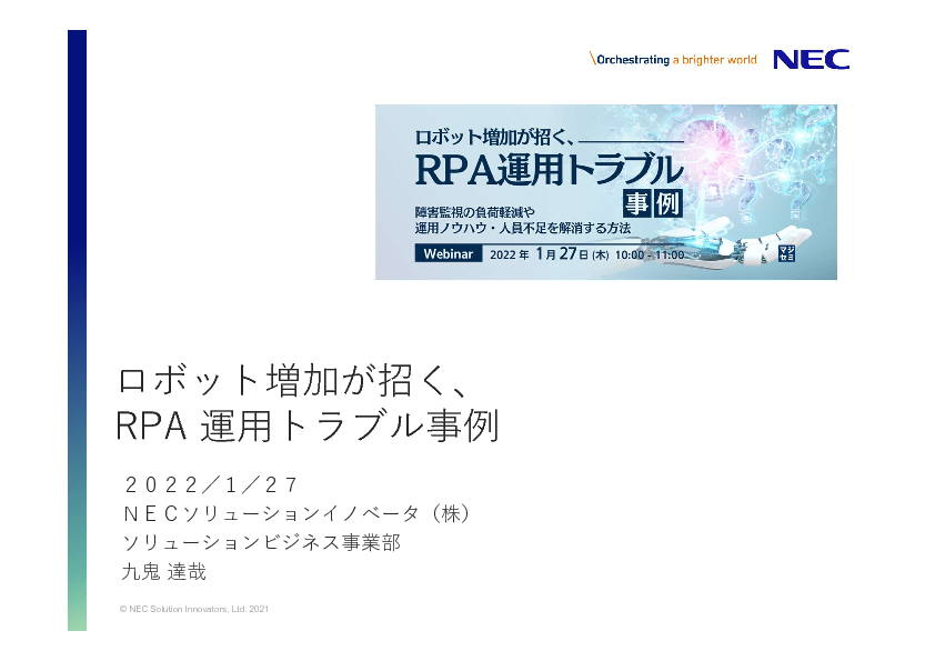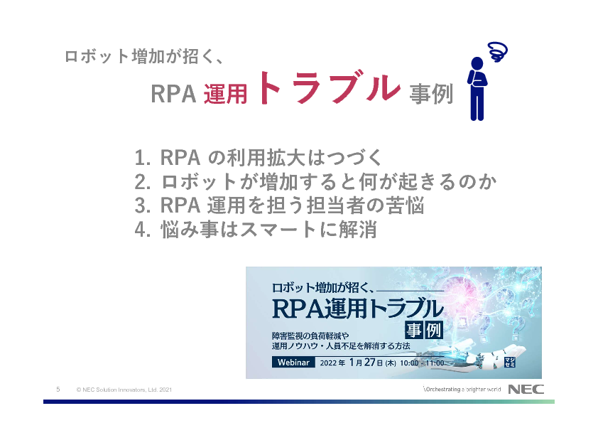 本セミナーでは、ロボット増加で発生するさまざまな運用トラブルの事例を解決するヒントを解説します。
