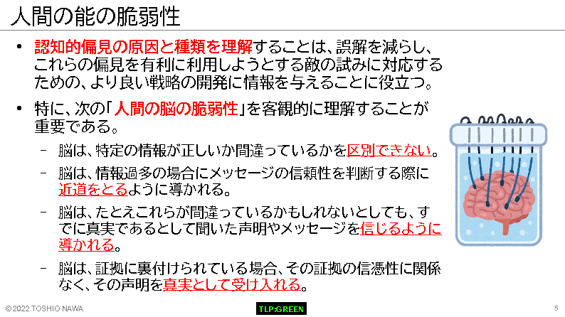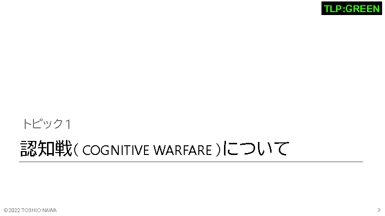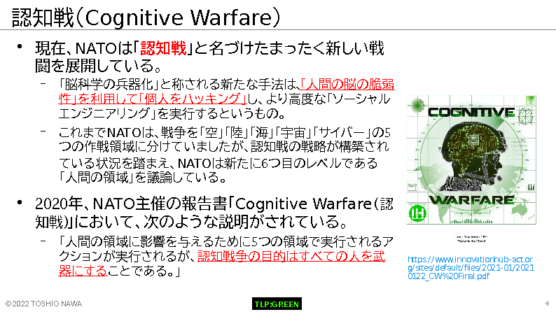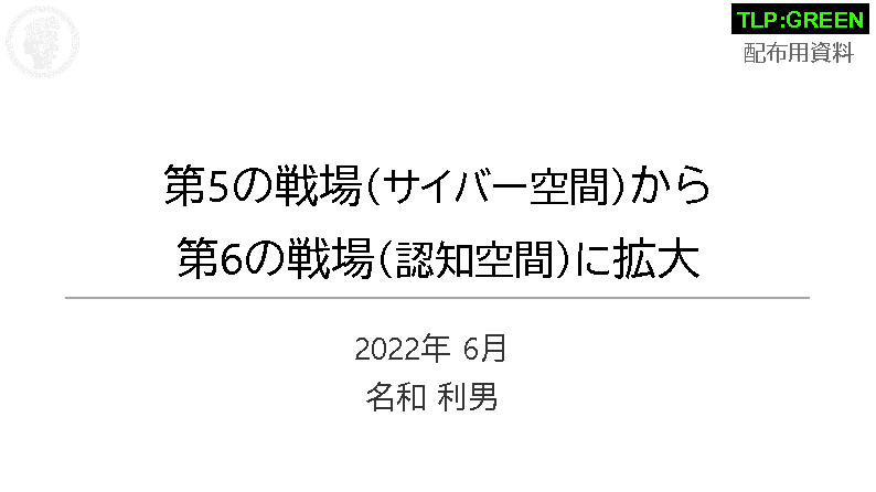 2010年代に米国防省が「サイバー空間」を陸・海・空・宇宙空間に次ぐ「第5の戦場」であるとし、サイバー攻撃に対して武力で反撃すると宣言してから約10年が経過しました。その後、2020年に示されたNATOの戦略文書では「認知戦(Cognitive Warfare)」という言葉が使用され、人々の認知機能を狙う「第6の戦場」が生まれています。特に、最近のウクライナ情勢では、発生した、いつくかのサイバー戦や情報戦がハイブリット化し、認知戦の様相を呈しています。第6の戦場と併せた、物理空間とサイバー空間のハイブリッド攻撃が現実に繰り返されているのです。