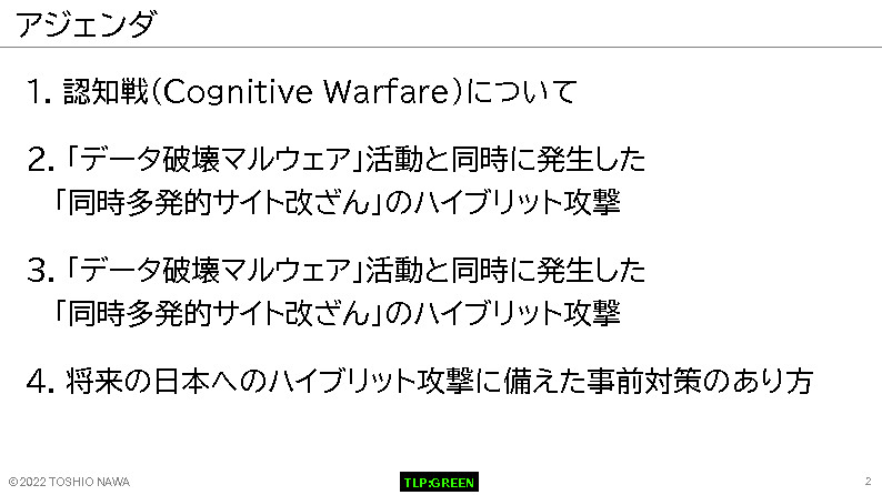 16:05~16:45 【基調講演】第5の戦場(サイバー空間)から第6の戦場(認知空間)への拡大状況について~ウクライナ情勢で発生したハイブリット化するサイバー戦と認知戦の観測から(テナブルネットワークセキュリティジャパン テクニカルアドバイザー名和利男氏)
