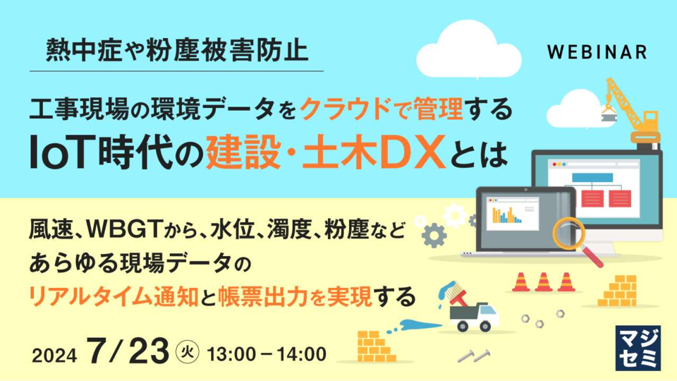 本セミナーでは、建設・土木の環境センシングIoTサービス「みまわり伝書鳩」を活用して、工事現場のさまざまな環境データをリアルタイムでモニタリングし、視覚や音声で効果的に通知する方法について、具体的な事例を交えて詳しく解説します。