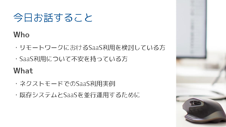 これからSaaSを導入したいという方には、業務効率化につながるSaaSを知る機会としていただけますし、すでにSaaSの利用を開始している方には、オンプレミスのシステムとSaaSを並行運用する際の注意点やノウハウを知っていただけます。