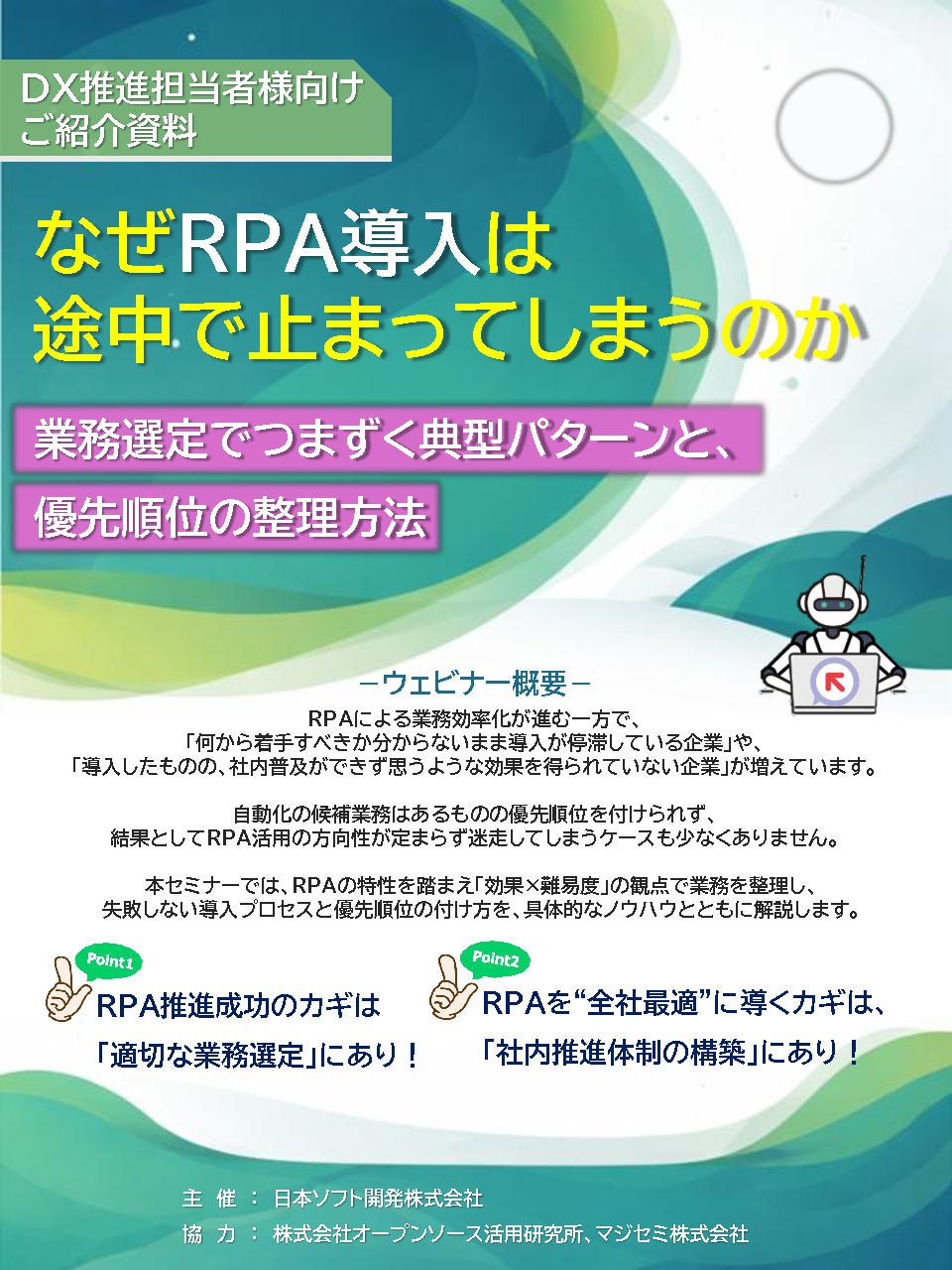 本セミナーでは、生成AI機能を強化した国内トップシェアRPA「WinActor」の認定技術者を多数抱える日本ソフト開発株式会社が、これまでに培った導入ノウハウを元に、対象業務をどのように整理し優先度を明確化すべきかといった評価手法や導入を着実に進めるために欠かせない要素などを詳しくご紹介します。