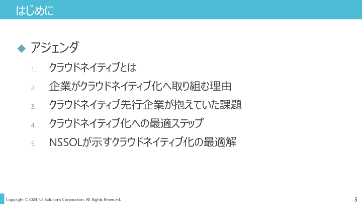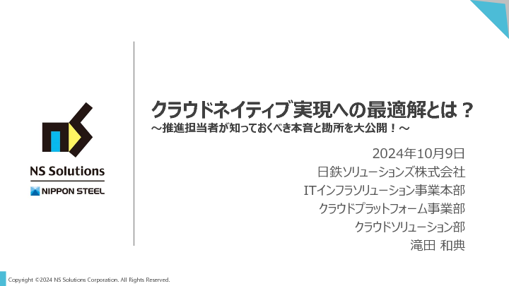 本セミナーでは、日鉄ソリューションズ(以下、NSSOL)から、実際にお客様が抱えていらっしゃった課題やNSSOLの実体験を共有しながら、クラウドネイティブ化を成功に導くための具体的なアプローチや実践方法について解説していきます。また、NSSOLのアセットを集約したクラウドネイティブ化の推進を支援するサービスについても、本セミナー限定でお伝えしていきますので、ぜひご参加ください!