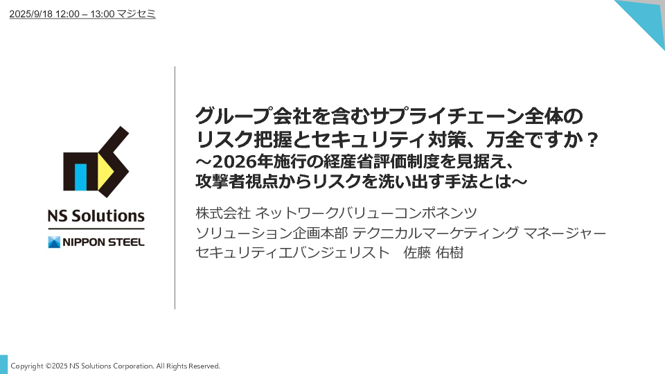 12:05~12:45 グループ会社を含むサプライチェーン全体のリスク把握とセキュリティ対策、万全ですか?~2026年施行の経産省評価制度を見据え、攻撃者視点からリスクを洗い出す手法とは~