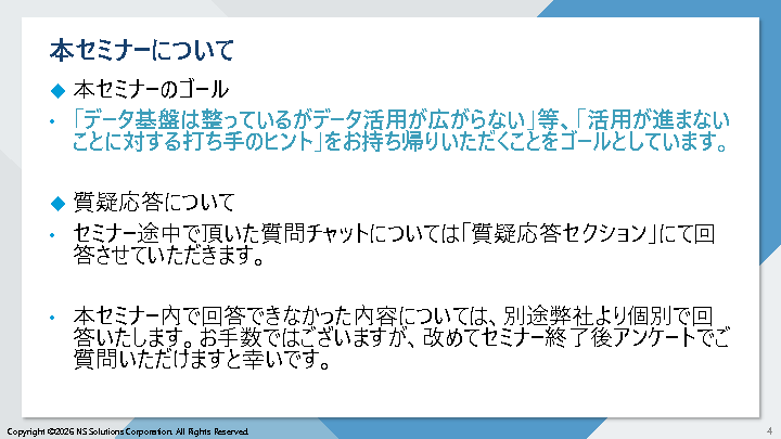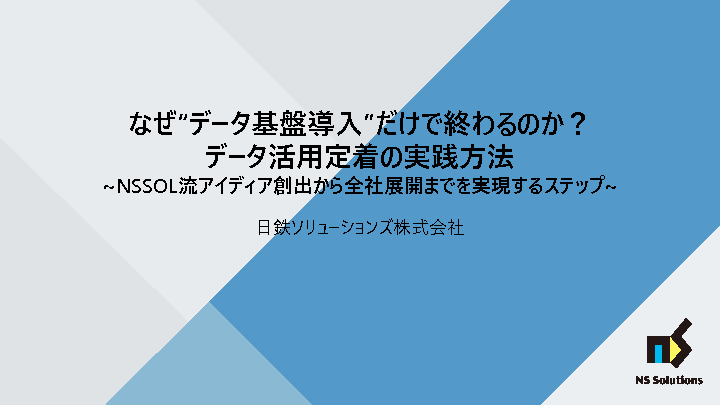 15:05~15:45 【大企業向け】なぜ“データ基盤導入”だけで終わるのか?データ活用定着の実践方法 ~NSSOL流アイディア創出から全社展開までを実現するステップとは~