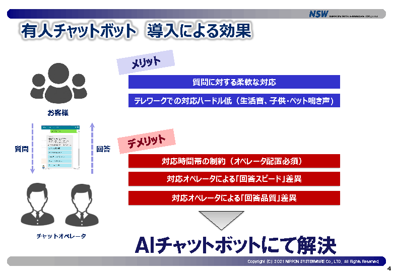 さらに、業務が変更になった場合、FAQなどの教師データを再作成し、再学習する必要があり、頻繁に業務の変更がある現場では、逆に負担になってしまうことも多いようです。