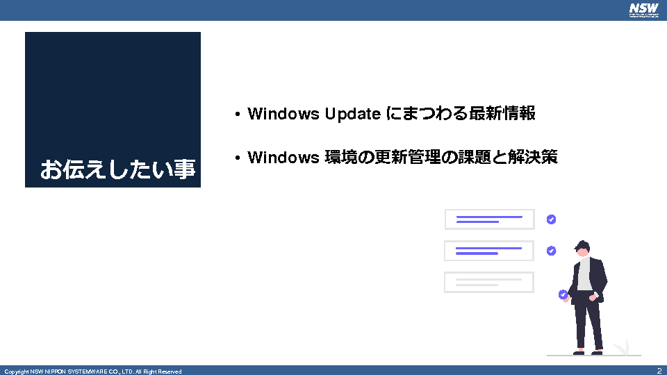 豊富な実績と最新のアップデート情報をもとに、これまで数多くの企業のWindows10への移行や運用をサポートしてきたNSW社の知見を提供する貴重な機会ですので、ぜひご参加ください。