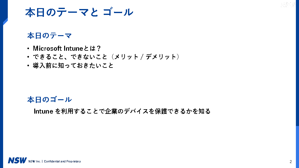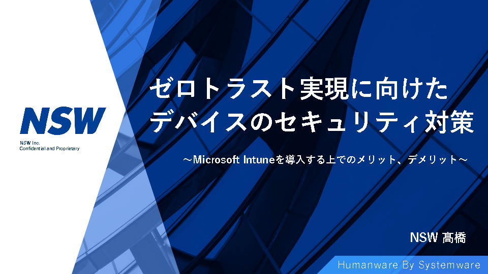 本セミナーでは、デバイス管理を検討しているお客様に対して、Microsoft Intuneを導入した場合のメリット、デメリットを解説致します。