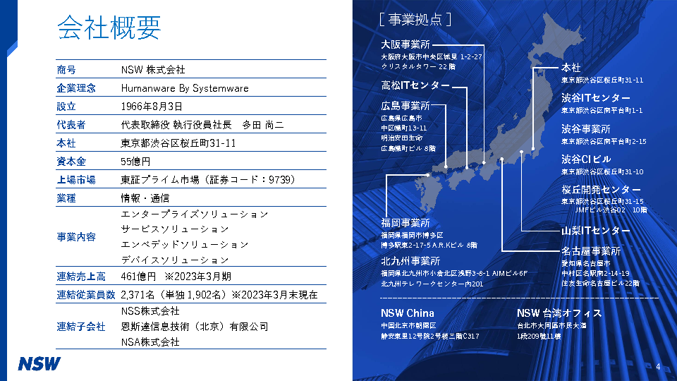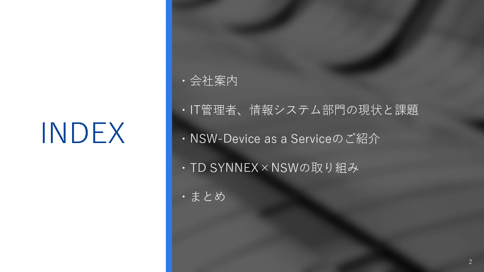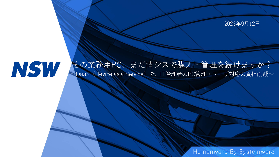 NSWでは、PCデバイスにキッティングやヘルプデスクサービスなどの各種サービスを月額制で提供するDaaS(Device as a Service)サービスを展開しています。企業内のクライアントPCにおける調達からキッティング、データ消去等に至る一連の業務を一括してお引き受けでき、また各サービスは出し入れ可能ですので、ご要望に合わせたカスタマイズも可能です。PCの調達やキッティング、PCデバイス管理、ユーザー問合せ対応などの運用を含めた、PCライフサイクルにかかる手間と労力にお悩みのIT管理者様、情報システム部門の方はぜひご参加ください。