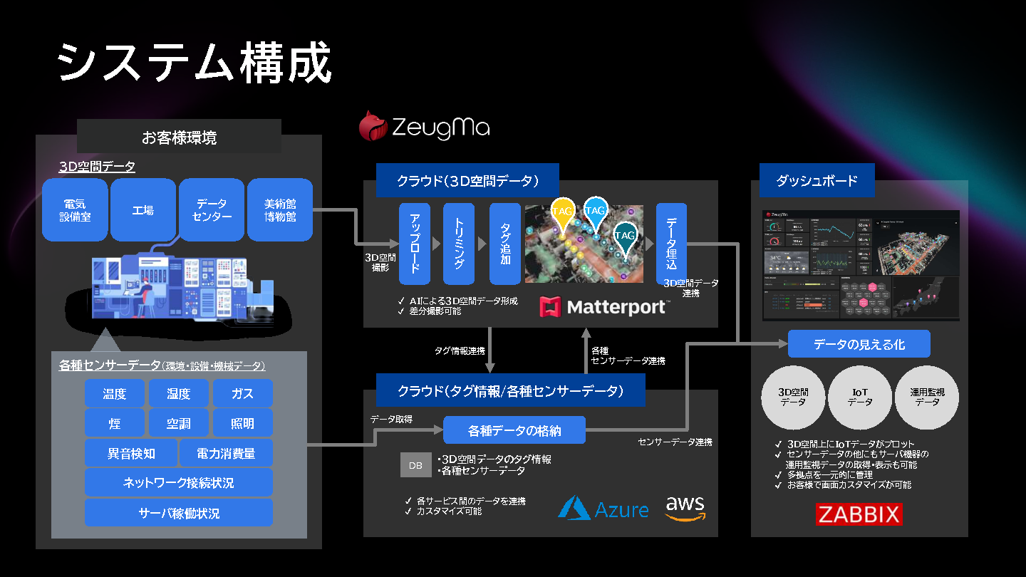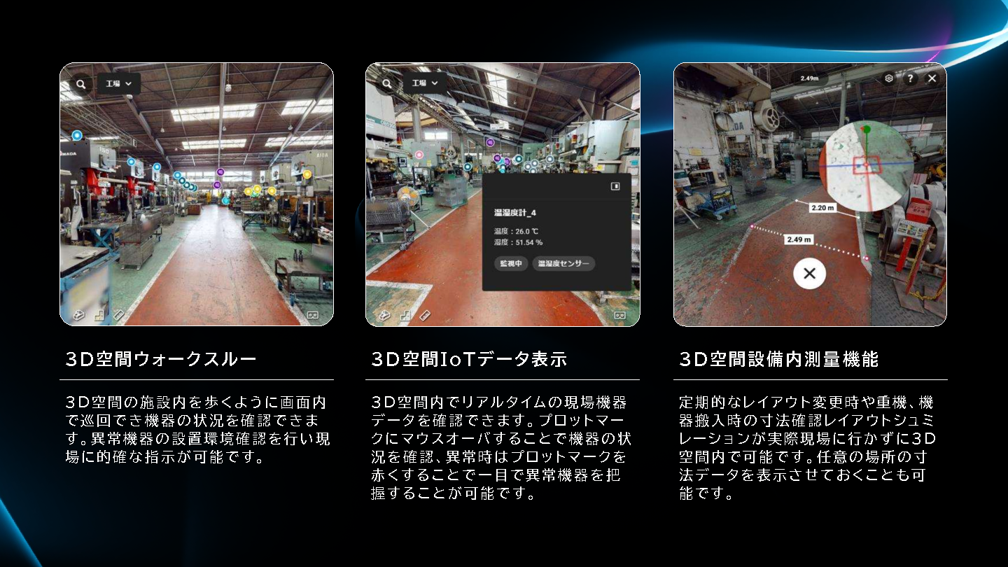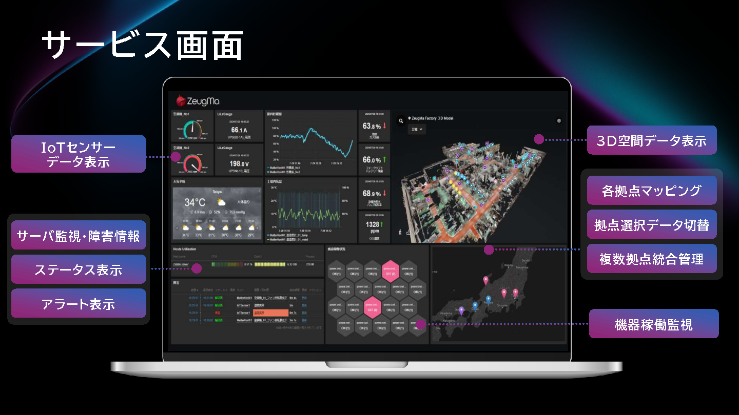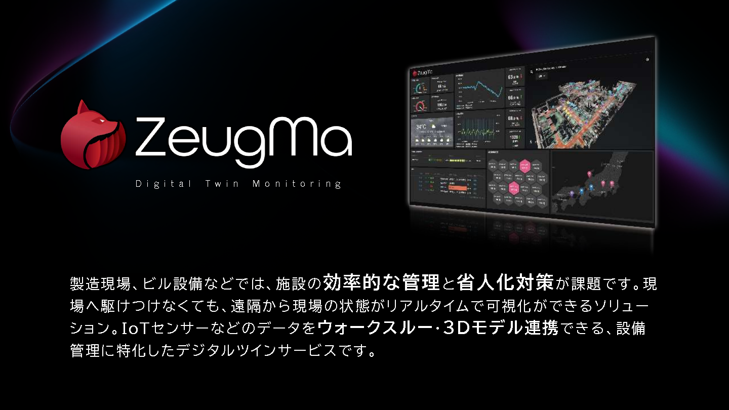 「ZeugMa(ジーグマ)」は、高精度3D撮影技術を活用し、工場空間を正確に再現するクラウド型デジタルツインソリューションです。仮想空間にセンサー位置やリアルタイムIoTデータを統合することで、遠隔から直感的に設備やセンサーの状態を把握でき、効率的な保全業務を実現します。また、仮想空間モデルは撮影データを基に構築されるため、ライン変更や装置更新時には該当箇所の再撮影だけで迅速かつ正確にモデルを更新できます。
