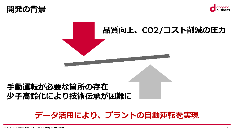 「AI Autopilot System / AI Soft Sensor」は、NTTコミュニケーションズの最先端AI技術を活用し、人の技能を模倣するAIが自動化を行う、日本発のプラント自動運転ソリューションです。このシステムは、熟練運転員の操作履歴や参考にしているデータを活用して、AIモデルを作成し、そのAIモデルが、材料投入や流量調整などの操作を代行します。これにより、従来自動化が困難だった複雑なプロセス制御の自動化を実現します。