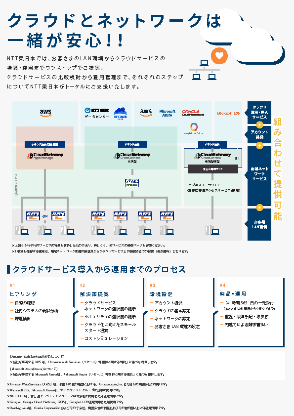 「クラウドゲートウェイ クロスコネクト」は、信頼性の高い閉域ネットワーク経由でクラウドサービスを利用したい法人のお客さま向けに、クラウドサービス(AWS、Google Cloud Platform、Microsoft 365、Microsoft Azure、NIFCLOUD、Oracle Cloud)およびNTT東日本のデータセンターへの接続を可能とする定額制のネットワークサービスです。