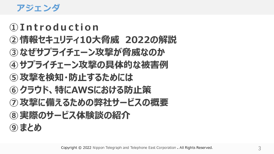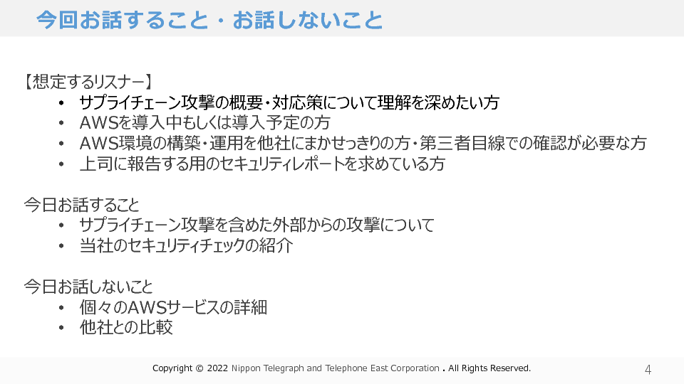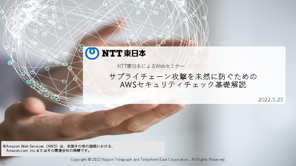 10:05~10:45 サプライチェーン攻撃を未然に防ぐためのAWSセキュリティチェック基礎解説(NTT東日本)