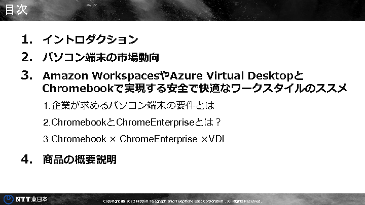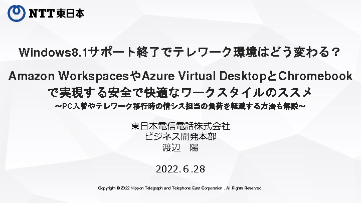 11:05~11:45 Windows8.1サポート終了でテレワーク環境はどう変わる?Amazon WorkSpacesやAzure Virtual DesktopとChromebookで実現する安全で快適なワークスタイルのススメ(NTT東日本)