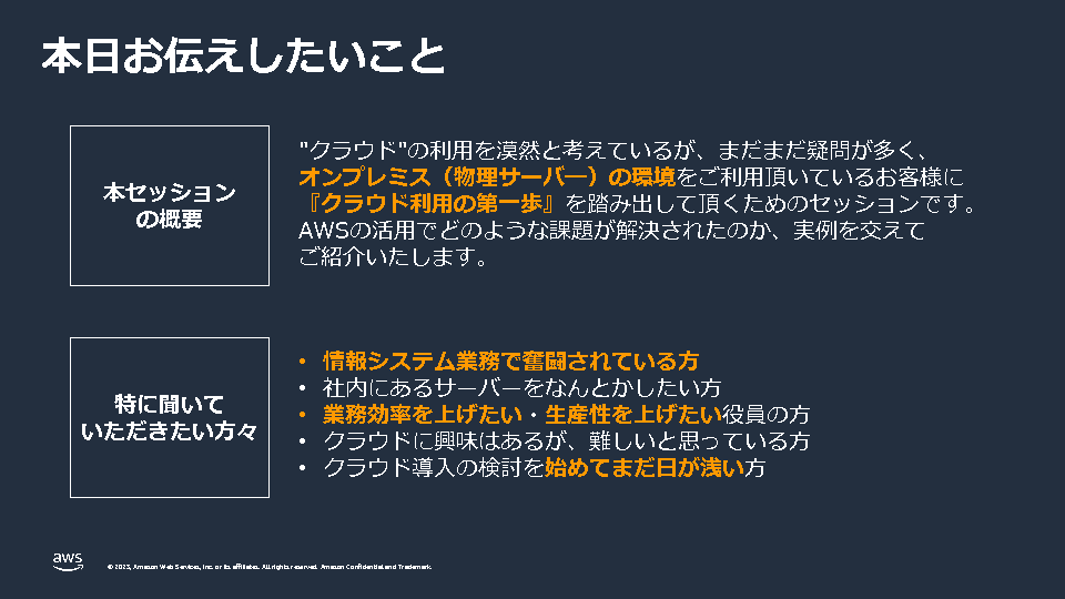 本セミナーでは、AWS導入の第一歩として、Amazon Connectやファイルサーバ移行といった取り組みやすいところから始める方法をご紹介します。
