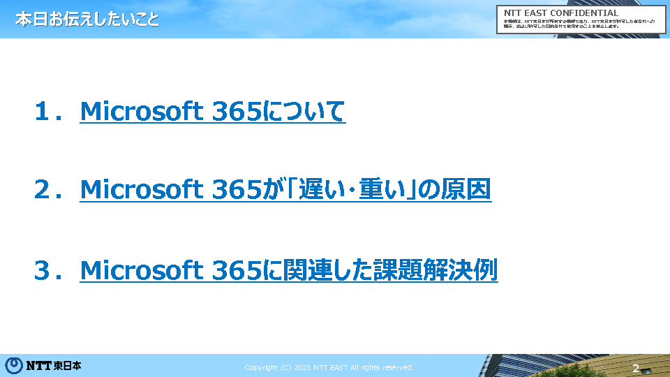 本セミナーでは、M365の「遅い・重い」という課題を閉域接続によって解決する方法を解説いたします。