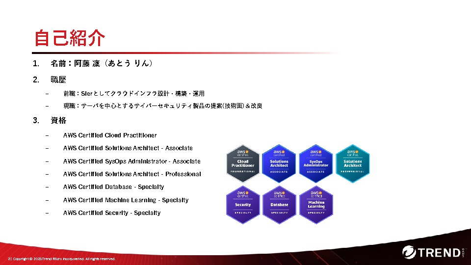 10:05~10:30 第一部 トレンドマイクロ株式会社 セキュリティエキスパート本部 セールスエンジニアリング部 サーバセキュリティチーム 阿藤 凜さま