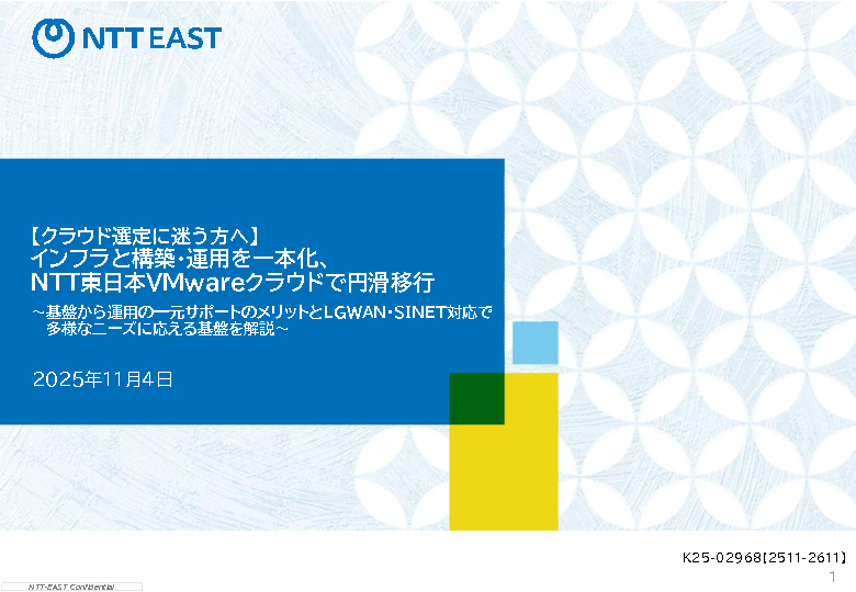 本セミナーでは、VMware環境からのクラウド移行を検討している企業に向け、基盤・構築・運用を一貫してサポートするNTT東日本の「VMwareクラウド」をご紹介します。NTT東日本のサービスは、クラウド基盤から閉域網、運用支援までを一体で提供し、各フェーズ間でのズレを解消します。これにより、移行から運用までスムーズに進行し、安心してクラウド環境を利用できるメリットを享受できます。また、LGWANやSINET対応など、特定のニーズに応じた対応も可能で、より幅広い分野での利用を支援します。