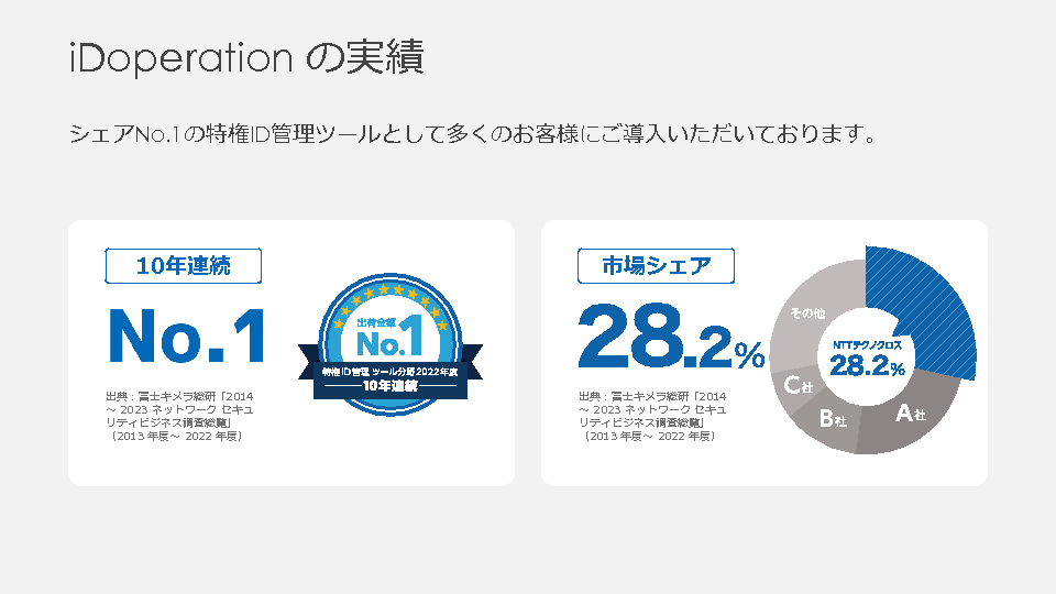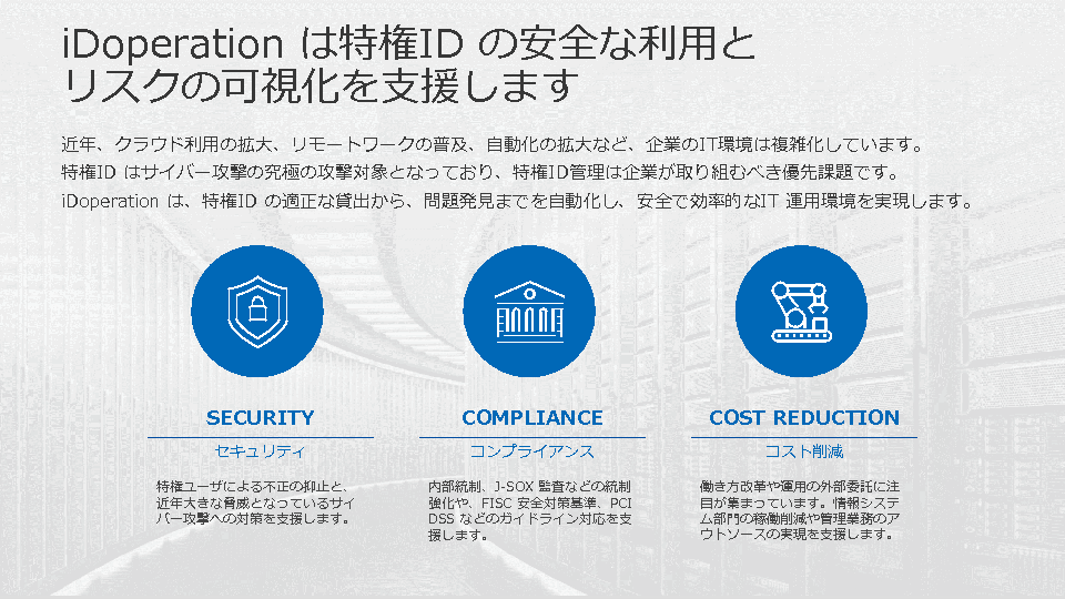 また、新しいリスクに備える内部不正対策における3つの再考ポイントと対策例を紹介。さらに具体的な解決策として特権ID管理「iDoperation Cloud」を提案し、内部不正による情報漏えいリスクを最小化する「特権アクセス管理(PAM)」ソリューションの活用方法を解説いたします。