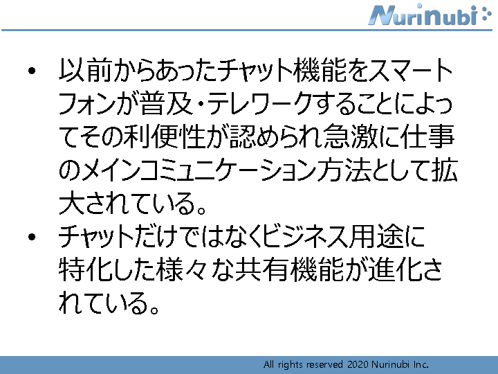 リモートワークの拡大に伴い、企業内や取引先とのコミュニケーションツールとして、 リアルタイムに簡単に連絡や情報共有ができる、ビジネスチャットツールが普及しています。