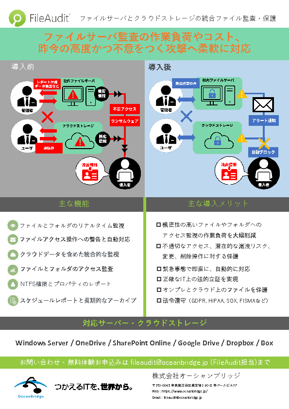 また、ISMS/ISO、NIST、GDPR、HIPPAなどの各種セキュリティ基準・法規制などに準拠した内部監査の強化や、コンプライアンス対策の高度化など、ファイルサーバー・クラウドの総合的なセキュリティ向上に役立つヒントを提示します。