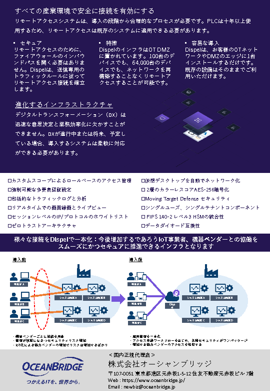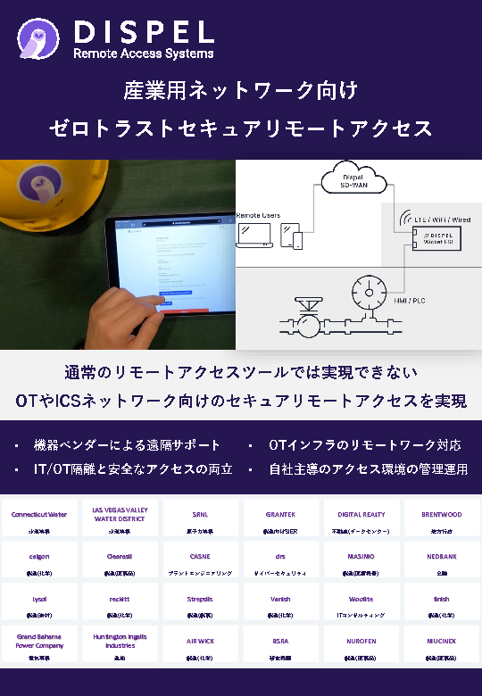 本セミナーではネットワークが分離されたOT環境に対して、IEC 62443、NIST CSFなどに準拠した産業用ネットワーク向けゼロトラストリモートアクセス「Dispel」について、製品概要・機能特長・利用シーンなどを交えながら解説します。また、通常導入前に実施されるPoC(評価検証)の進め方も補足します。