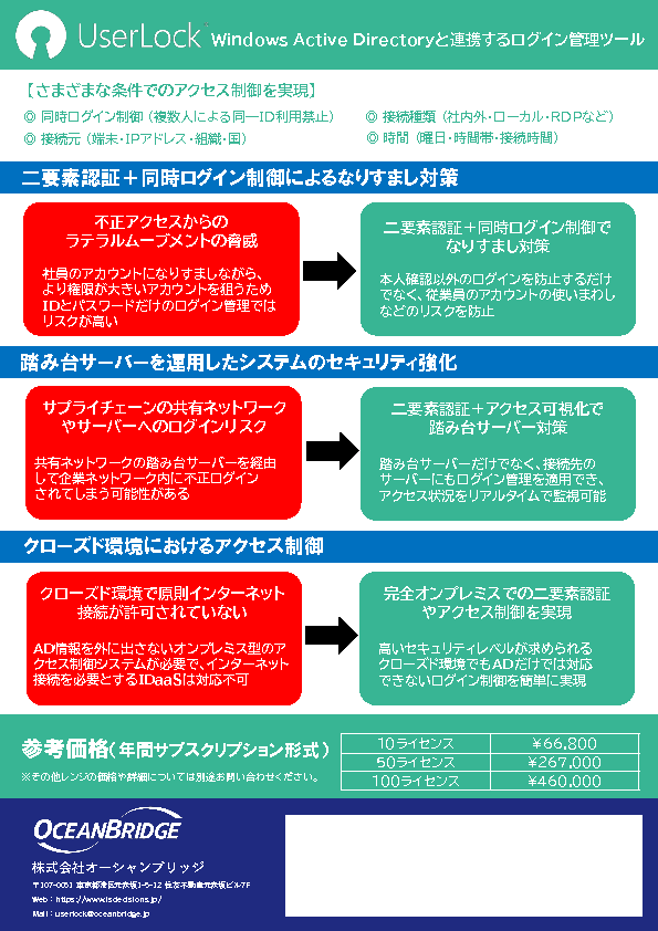 具体的な手段として、既存のシステム構成を変えずに最小限の投資で利用でき、Active Directoryと連携してログイン制御やユーザー監視を行える「UserLock」を用いた対策と、多層防御によるセキュリティ強靭化の方法を紹介します。