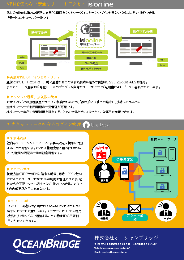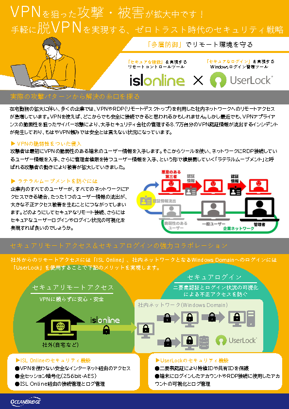 本セミナーでは、VPNや高額なPAMに頼ることなく、実践的かつシンプルに「リモート接続前」と「接続後」の両面から企業の情報資産を守る方法を解説します。VPN不要で安全なアクセス環境を即日構築できる「ISL Online」と、既存のActive Directoryに多要素認証・アクセス制御を追加する「UserLock」を組み合わせることで、セキュアなリモート環境を手軽に構築可能です。専門知識や人材リソースに依存せず、現実的かつ効果的な多層防御を実現する方法を、実際の導入事例を交えてわかりやすくご紹介します。