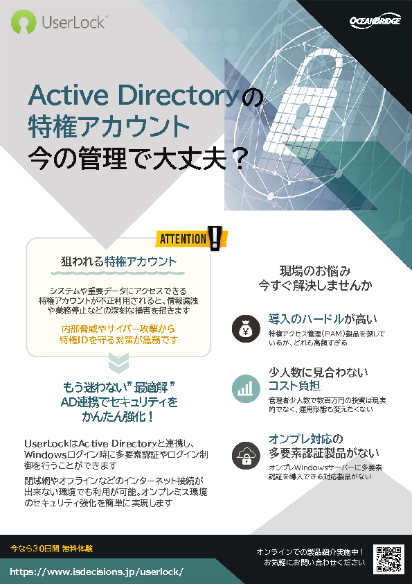 本セミナーでは、ランサムウェアの重要対策の1つである、侵入後に被害を拡大させる要因になりやすい「管理者なりすまし」を抑えるためのMFAの考え方と、オンプレADに後付け導入できる「UserLock」の活用ポイントを解説します。UserLockは、ADアカウントのWindowsログイン(対話型セッション)にMFAを実装することができ、管理者アカウントのサーバー・PCのログイン時のMFAはもちろん、一般ユーザーも含めた展開も可能です。オンプレADの認証強化に関心のある方はぜひご参加ください。