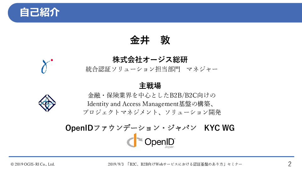 本セミナーでは、B2B・B2CビジネスにおけるWebサービスのモデルケースと認証基盤の役割について解説します。そして、サービス提供者がおさえておくべき認証技術(OpenID Connect、OAuthなど)と最新動向について解説します。