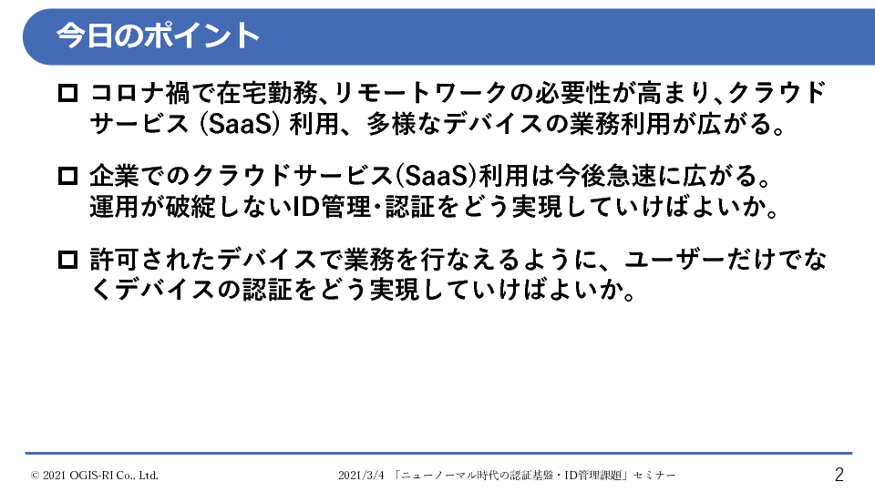 本セミナーでは、ニューノーマル時代に企業が目指すべきIT環境と、認証基盤・ID管理で