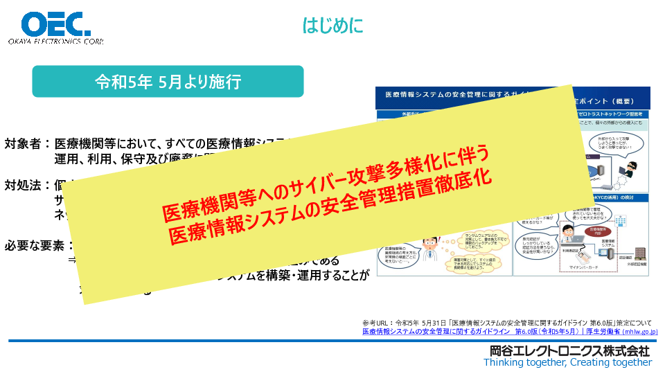 医療機関を攻撃対象とする同種攻撃は近年増加傾向にあり、その脅威は日増しに高まっています。ランサムウェアによるサイバー攻撃事案が発生し、電子カルテの閲覧・利用ができなくなるなど、地域の医療提供体制に影響が出ており、厚労省からも注意喚起がされております。