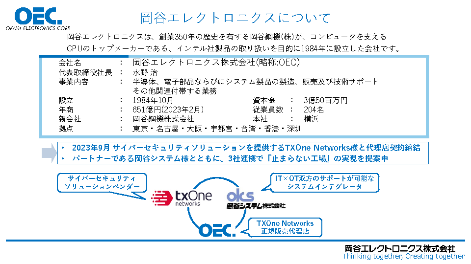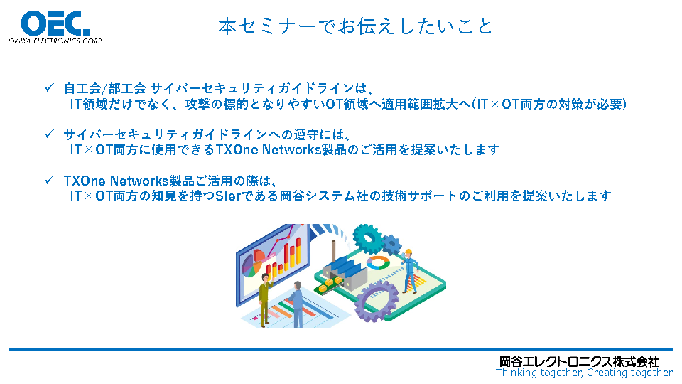 本セミナーでは、自工会や部工会所属のIT部門を対象に、ITとOTの双方に精通した岡谷システムが提供するIT/OT統合支援サービスと、TXOne Networksが提供する資産情報の収集や検査からエンドポイント保護、ネットワーク防御まで対応するOT特化型セキュリティソリューションを活用し、セキュリティガイドライン「レベル1」を効率的にクリアするための具体策について解説します。