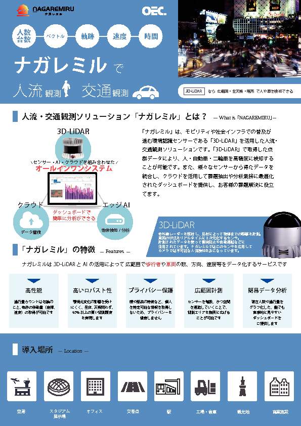 3D-LiDARを活用した人流・交通観測ソリューション「ナガレミル」のシステム構成や分析機能、空港・スタジアムなどでの導入事例をご紹介します。
