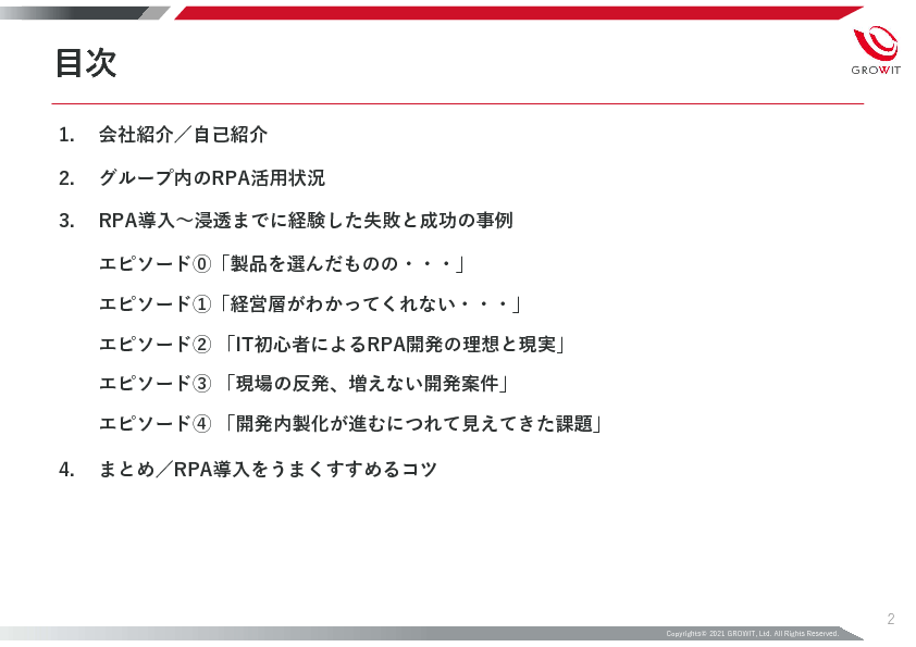 本セミナーでは、自社にRPAを導入したGROWIT株式会社が、自らの体験をベースに、なぜ企業におけるRPA導入が失敗するのか?成功させるためのポイントは何なのかについて解説します。