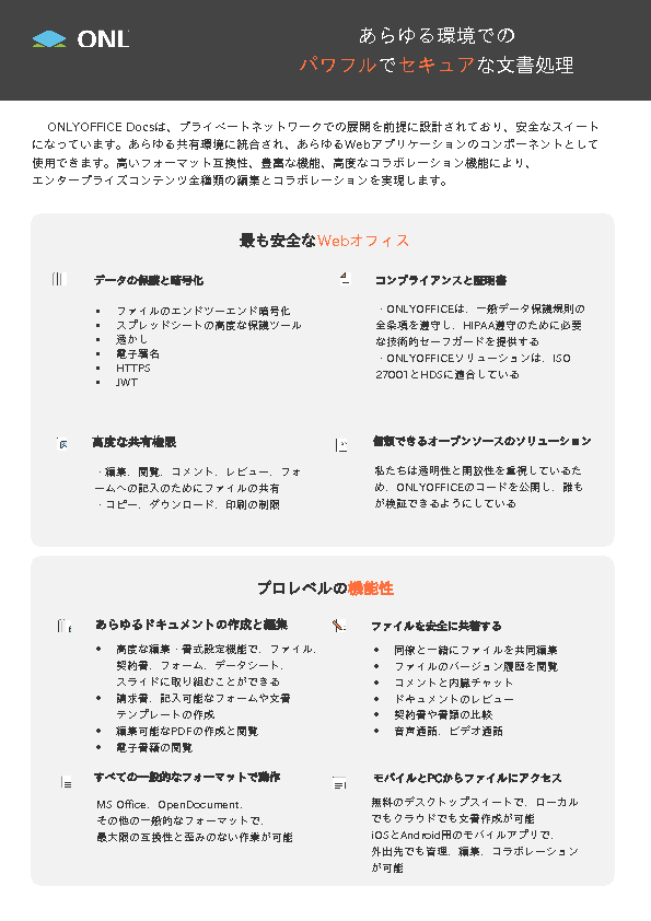 ONLYOFFICEは、エンドツーエンド暗号化により高いセキュリティを保ちながら、多様なファイル形式に対応し、他のクラウド型オフィスとの併用も可能な柔軟性を備えています。