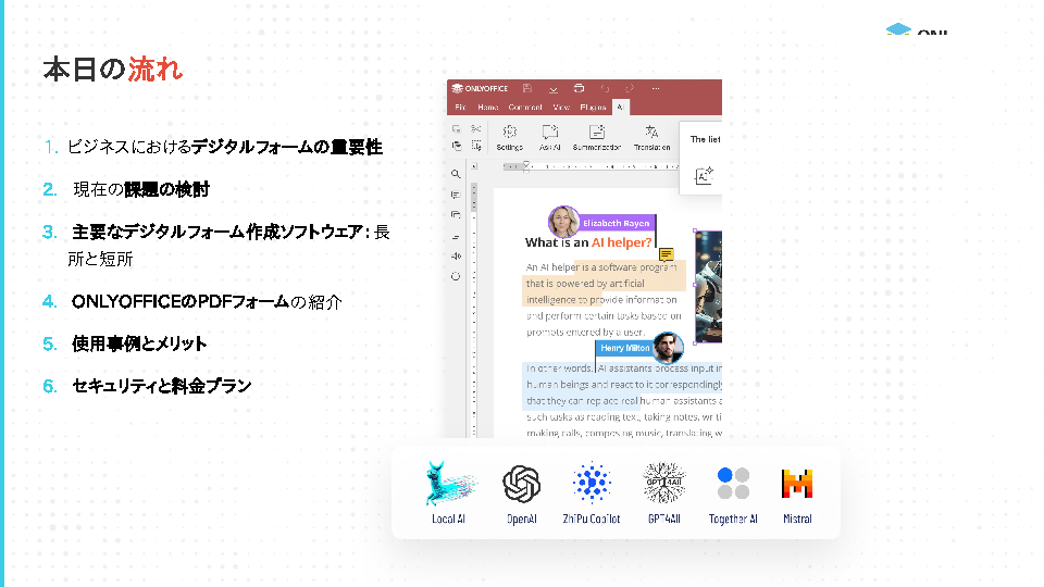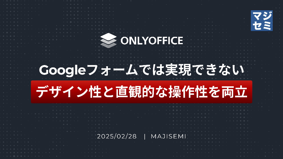 本セミナーでは、デザイン性と直観的な操作性を両立する「ONLYOFFICE DocSpace フォーム記入ルーム」を活用事例やデモとともにご紹介します。