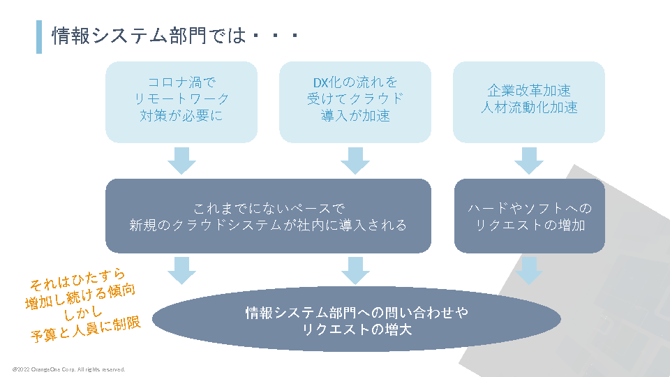 企業のDX推進のためには、企業内にばらまかれたクラウドを現場で使いこなす必要があるのですが、しかしITに不慣れな現場ではそれがおぼつきません。そこで情シスの登場となるわけですが、そもそも情シスは既存の社内サポート業務でパンクしている中、人員や予算は増えることなく、コロナによる在宅対応でばらまかれたクラウドの対応にいまや四苦八苦しています。
